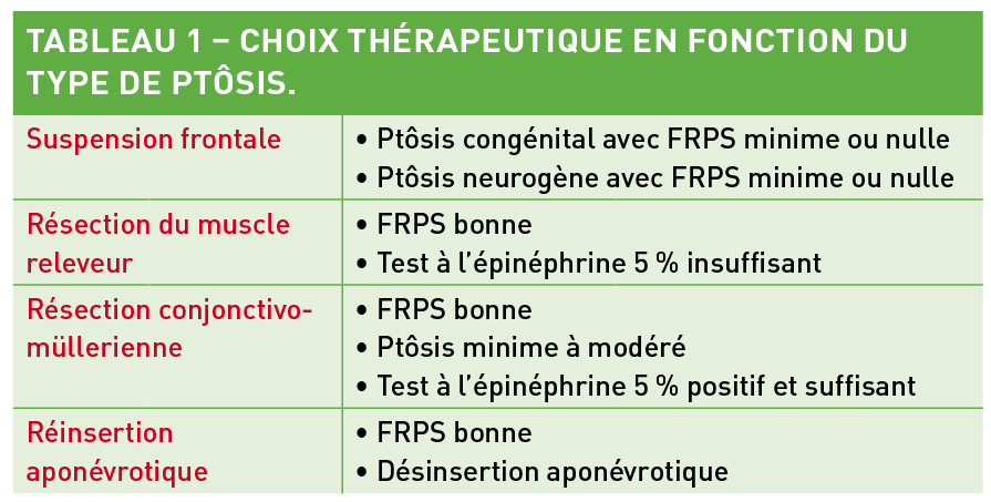 La technique chirurgicale dépend de l’étiologie du ptôsis, de la fonction du muscle releveur de la paupière supérieure (FRPS) et du degré de sévérité du ptôsis.