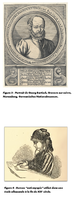 Bien que foncièrement opposé à l’utilisation des lunettes comme traitement correcteur de la myopie [4], l’allemand Georg Bartisch (Figure 3), considéré comme l’un des pères de la chirurgie ophtalmologique, dès 1583, estimait délétères le travail en vision rapprochée ainsi que le manque de lumière [5], sans en maîtriser cependant la physiopathologie.