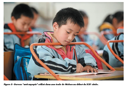 Des pupitres hygiéniques sont développés à l’école sur les recommandations de l’ophtalmologue allemand Hermann Cohn qui affirme dans son ouvrage Hygiène des Auges [5] que le travail de près est un facteur de risque de développement de la myopie [7], faisant écho aux bureaux équipés de barres métalliques utilisés de nos jours dans certaines écoles de Chine (Figures 4 et 5).